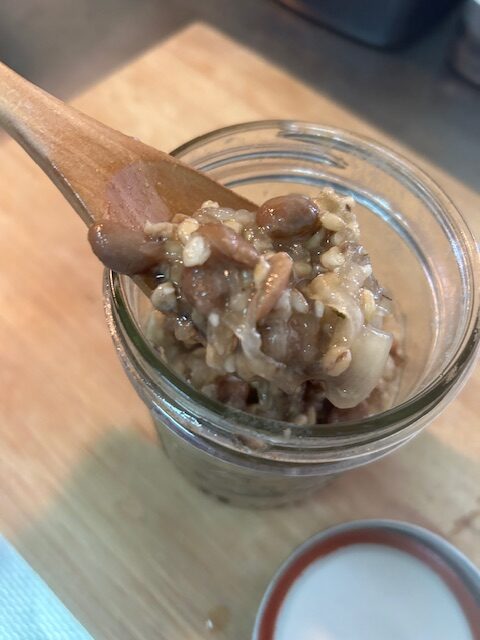 2、ひしおの麹を混ぜて、1時間くらいおく。10%塩水を入れて混ぜる。